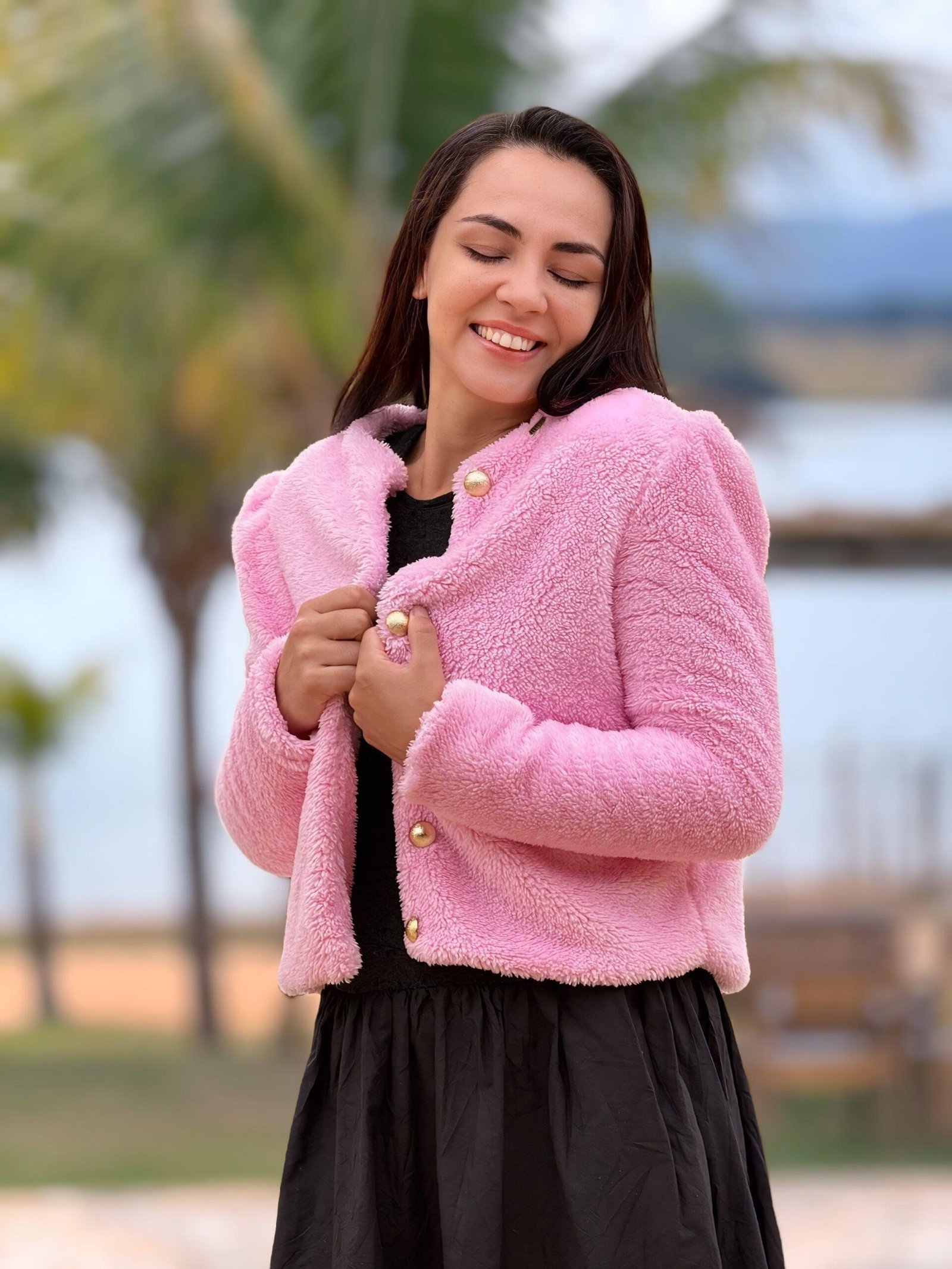 O Casaco Aline Vieira é uma das estrelas do nosso lançamento de alto inverno. Feito em pelo rosa de toque macio e visual sofisticado, ele combina charme e funcionalidade com uma proposta versátil: pode ser usado dos dois lados, ampliando suas possibilidades de styling.