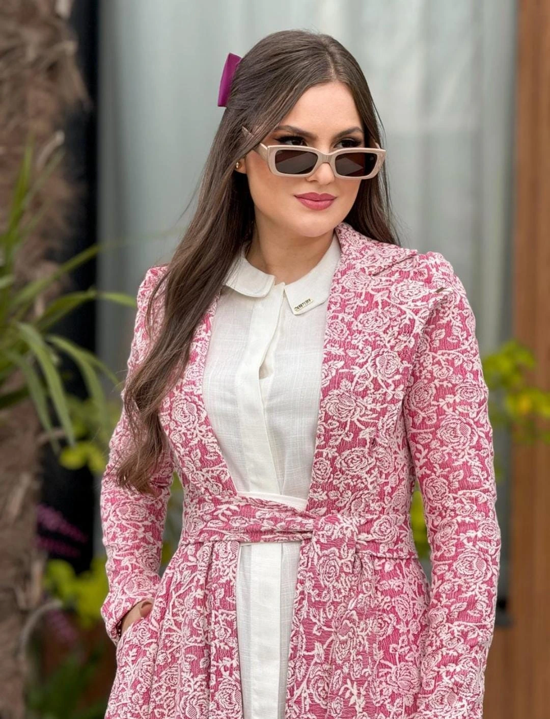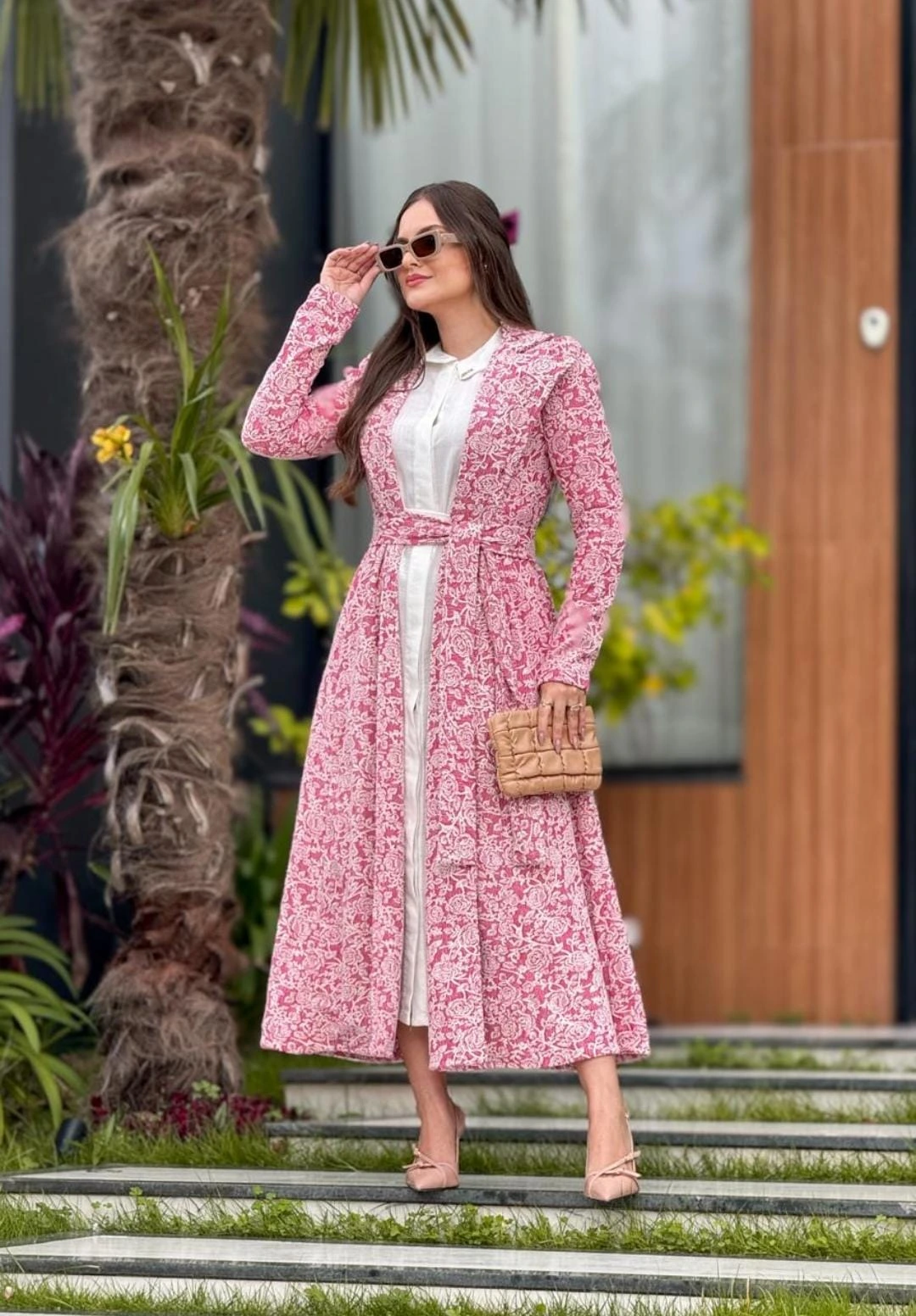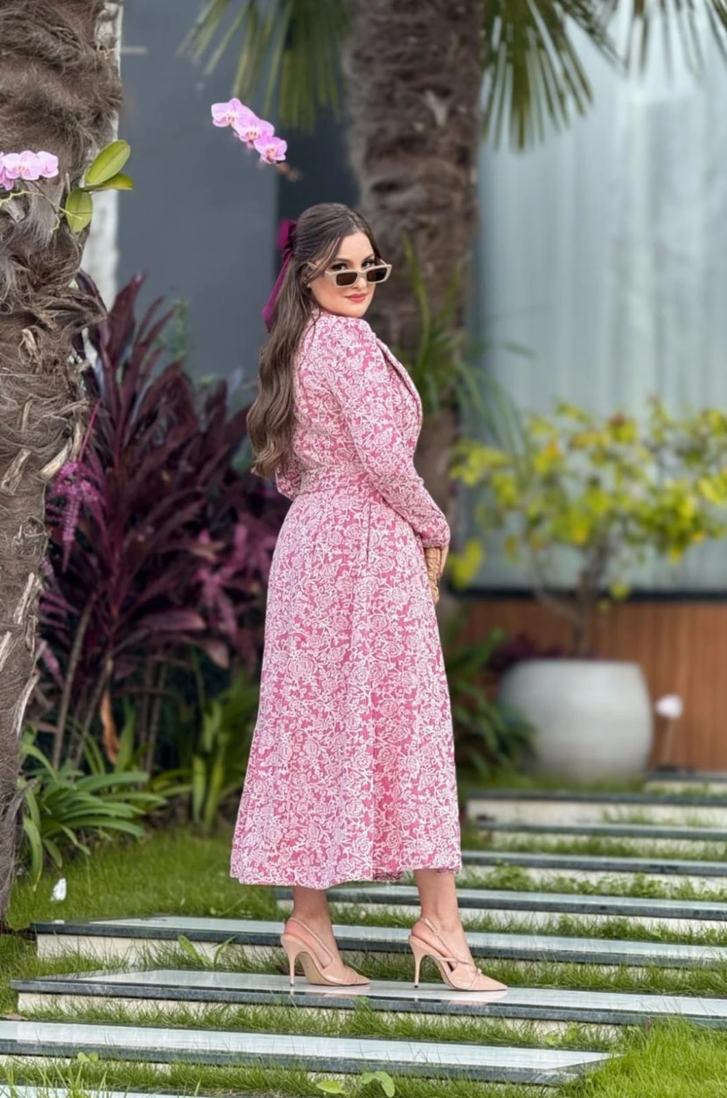Casaco e vestido florença possui gola de blazer estruturada, comprimento de trend coat/midi, manga longa franzido no ombro dando todo o charme.