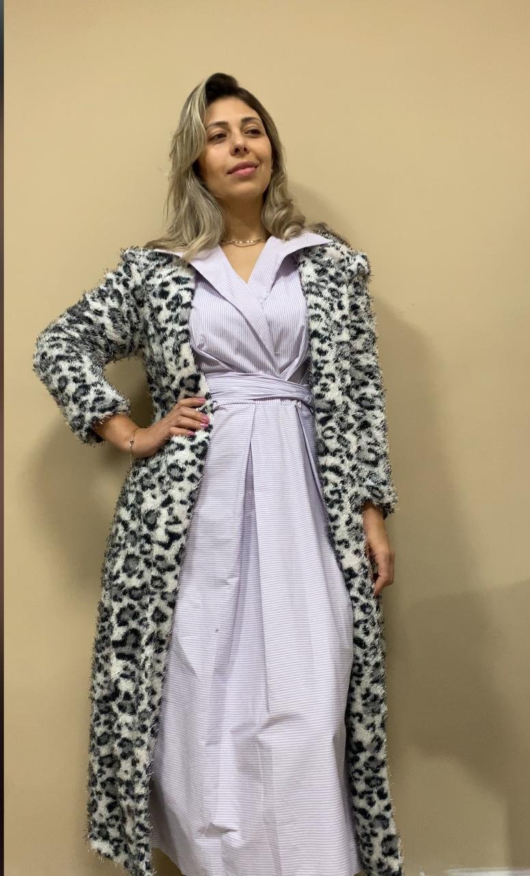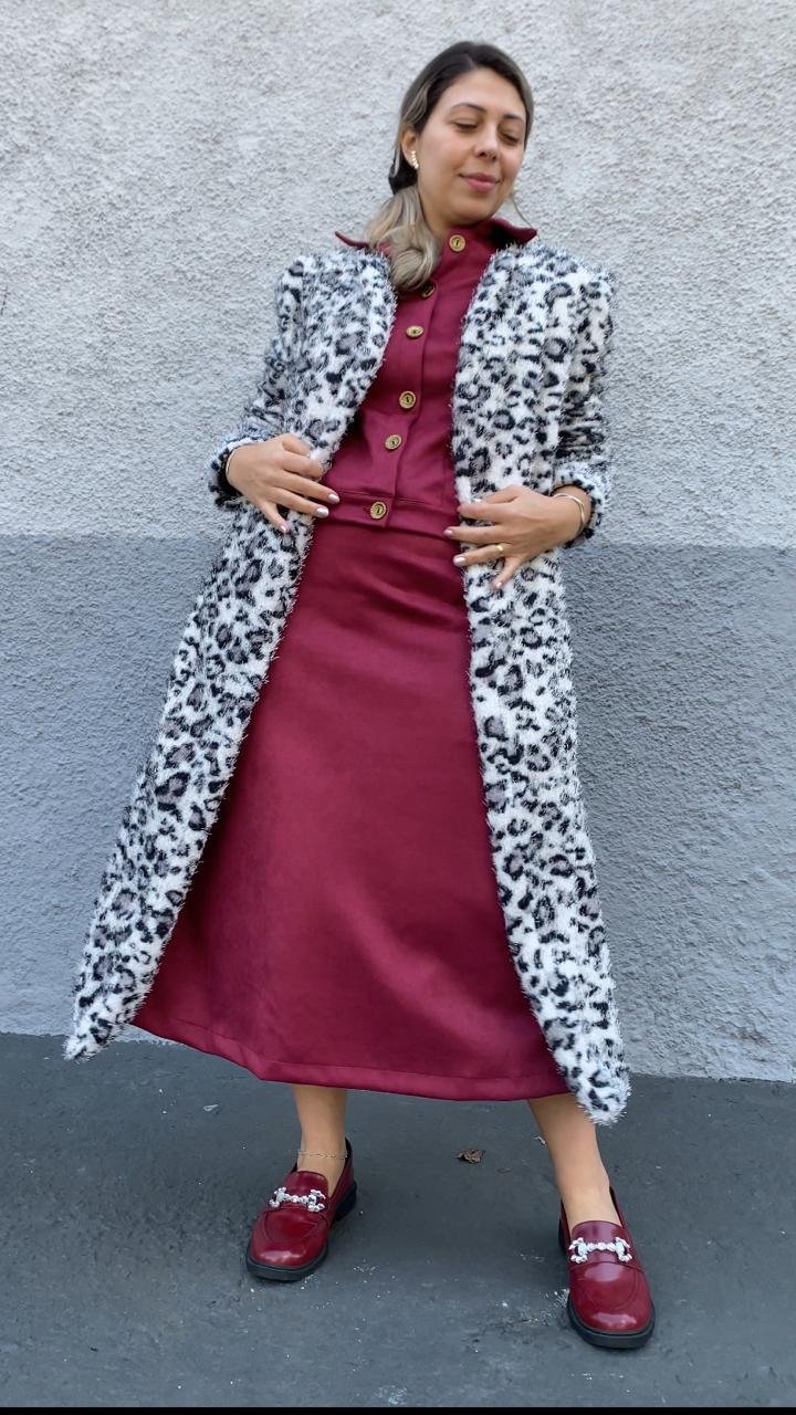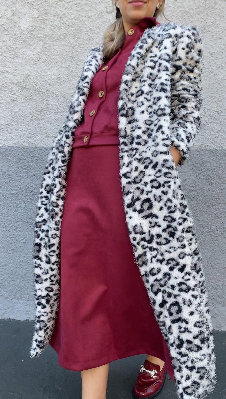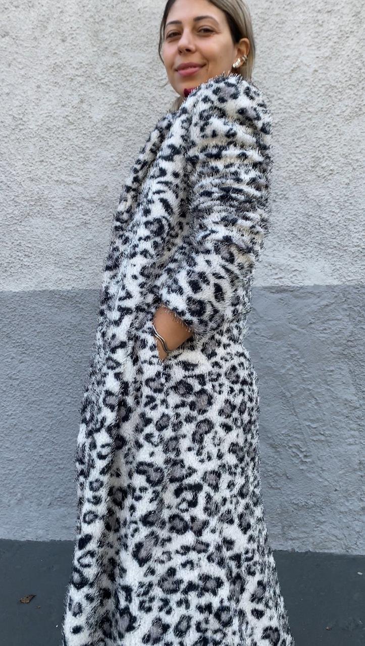 Seu comprimento alongado, aliado à clássica estampa leopardo em tons neutros, cria um visual marcante e atemporal — ideal para os dias mais frios da temporada.
