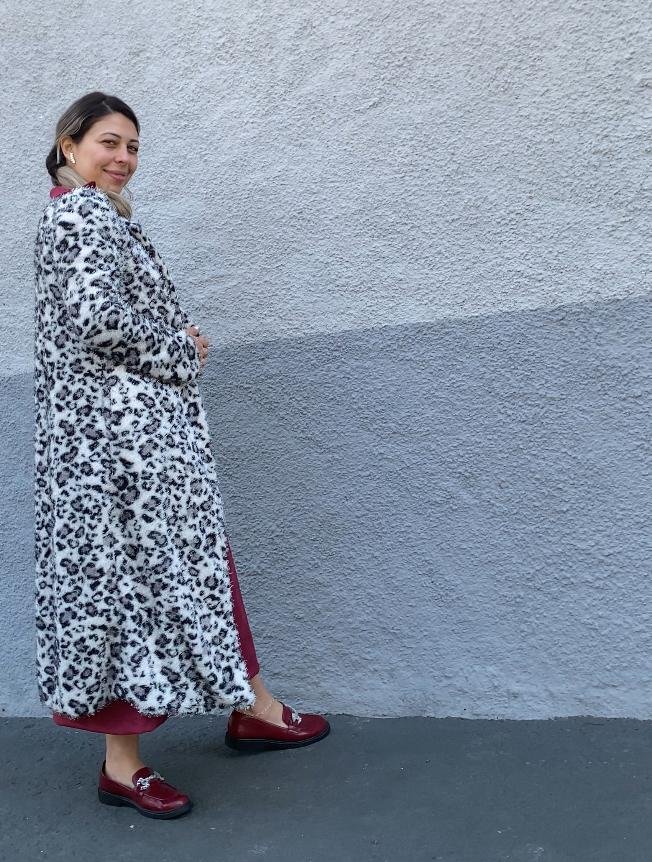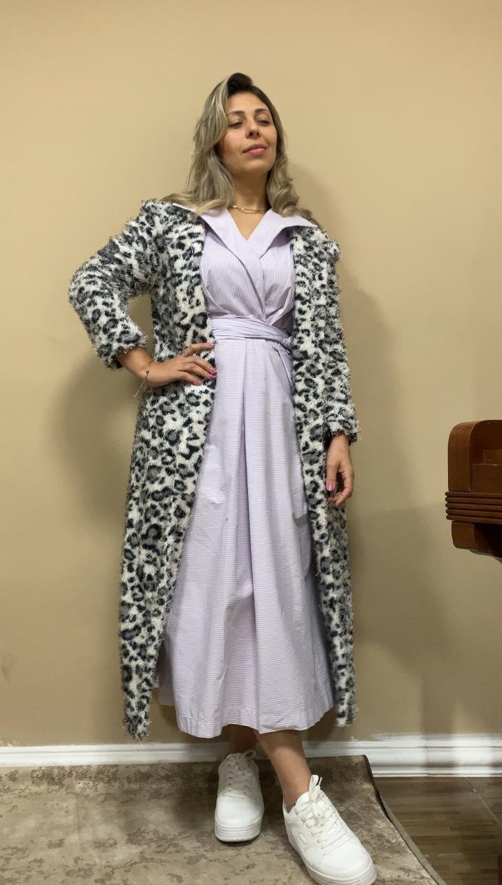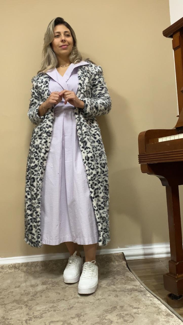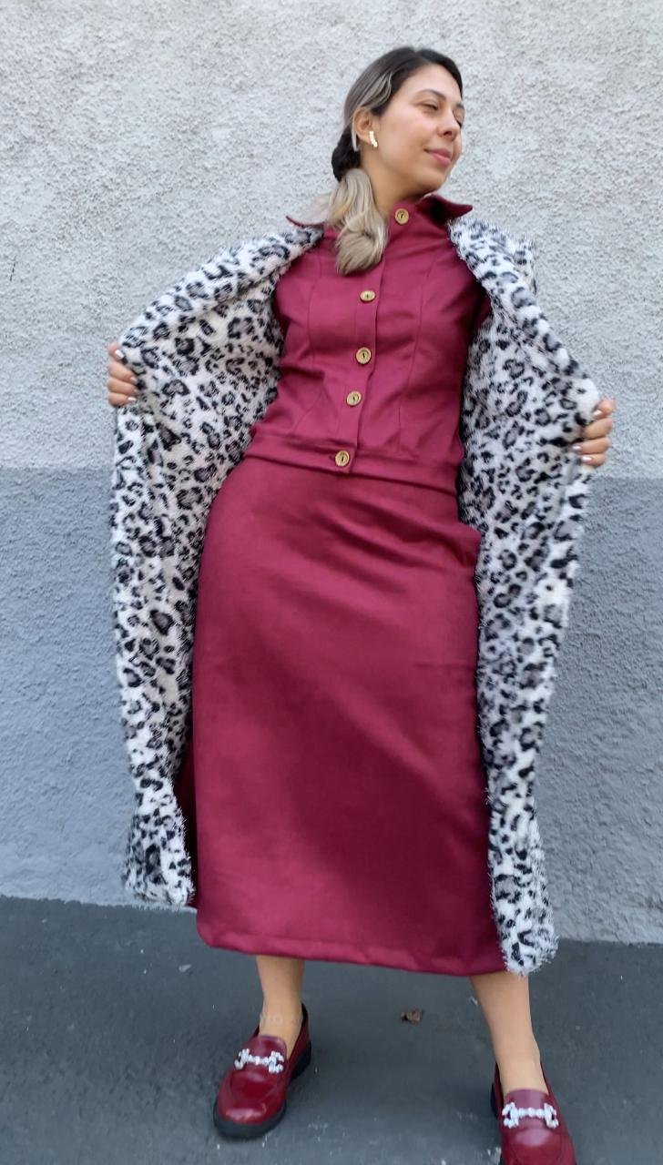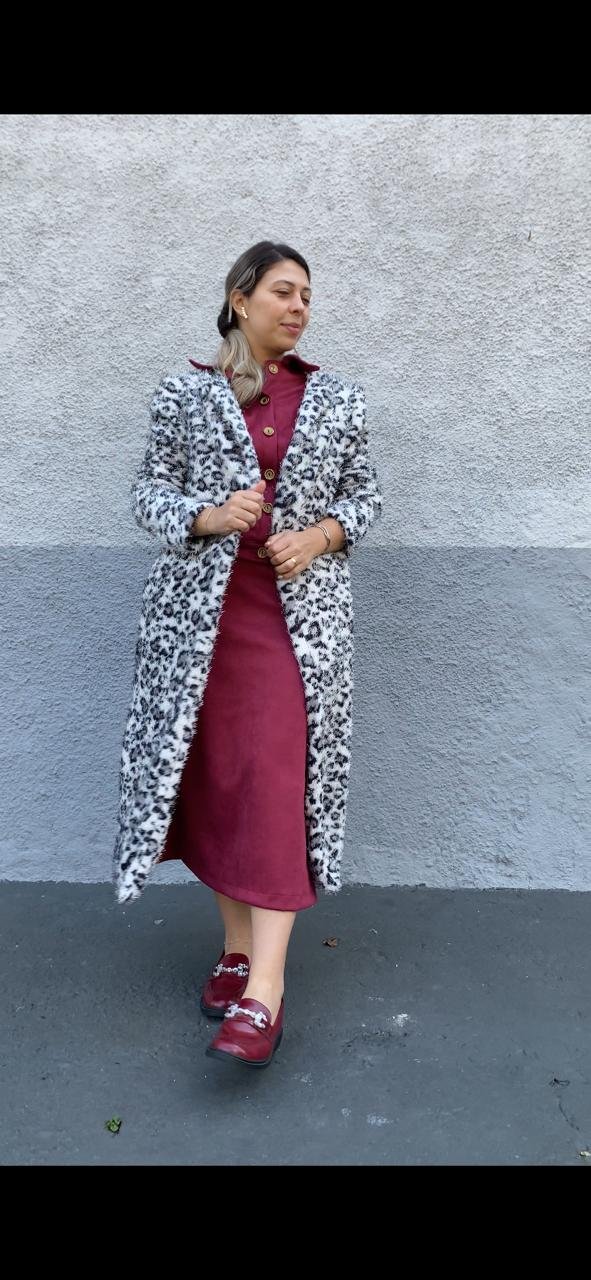 Seu comprimento alongado, aliado à clássica estampa leopardo em tons neutros, cria um visual marcante e atemporal — ideal para os dias mais frios da temporada.
