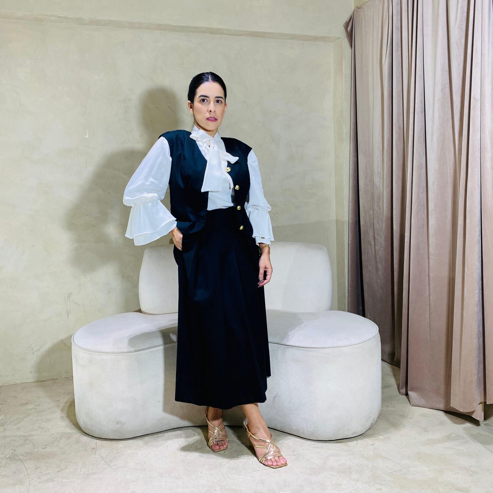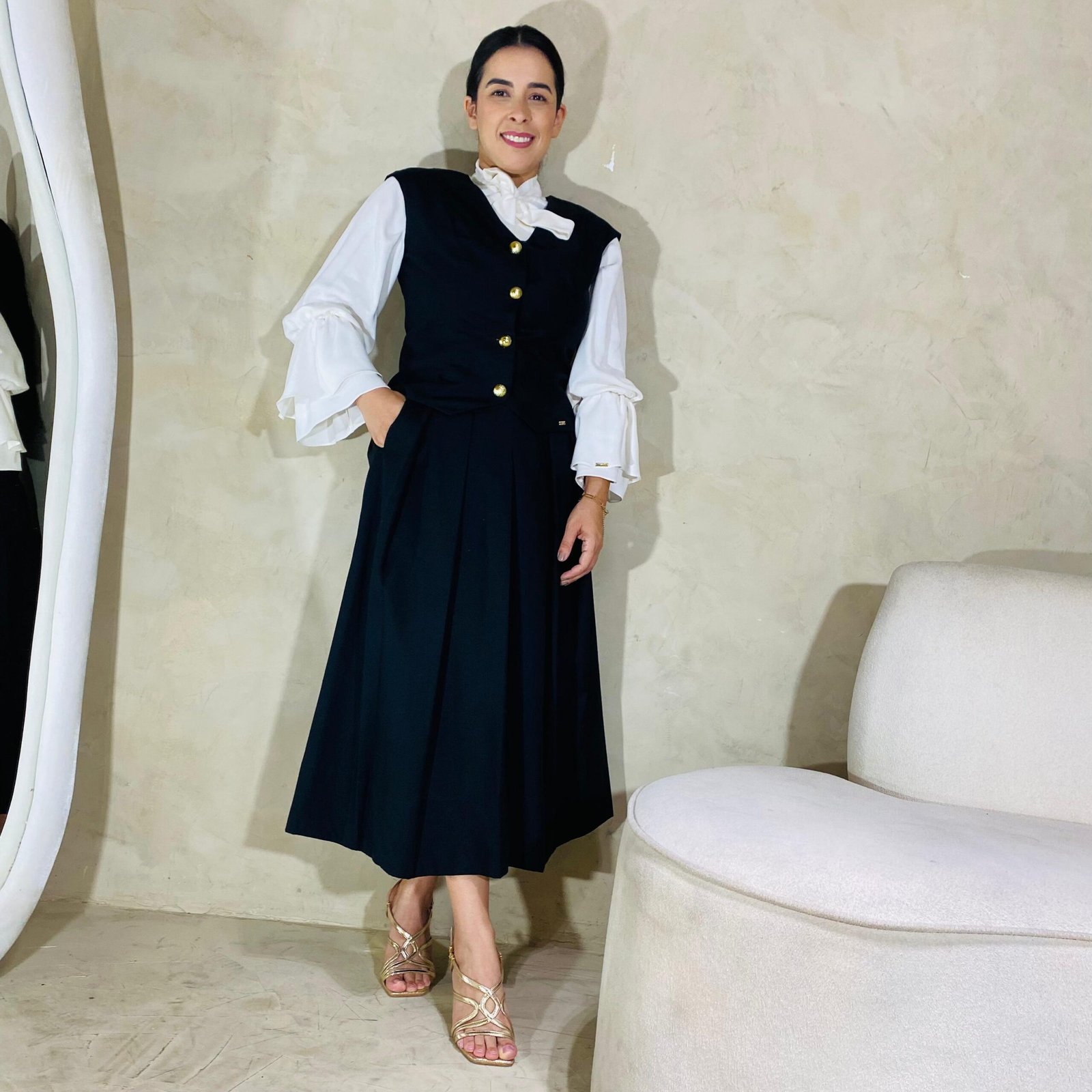 Elegante e versátil, este colete clássico na cor preto, é sem dúvida uma peça atemporal para compor looks modernos e refinados. O design estruturado conta com decote V, botões funcionais frontal, lapelas com botão decorativo, possui tecido de alta qualidade, proporciona conforto e caimento perfeito. Ideal para sobreposições estilosas em qualquer estação.