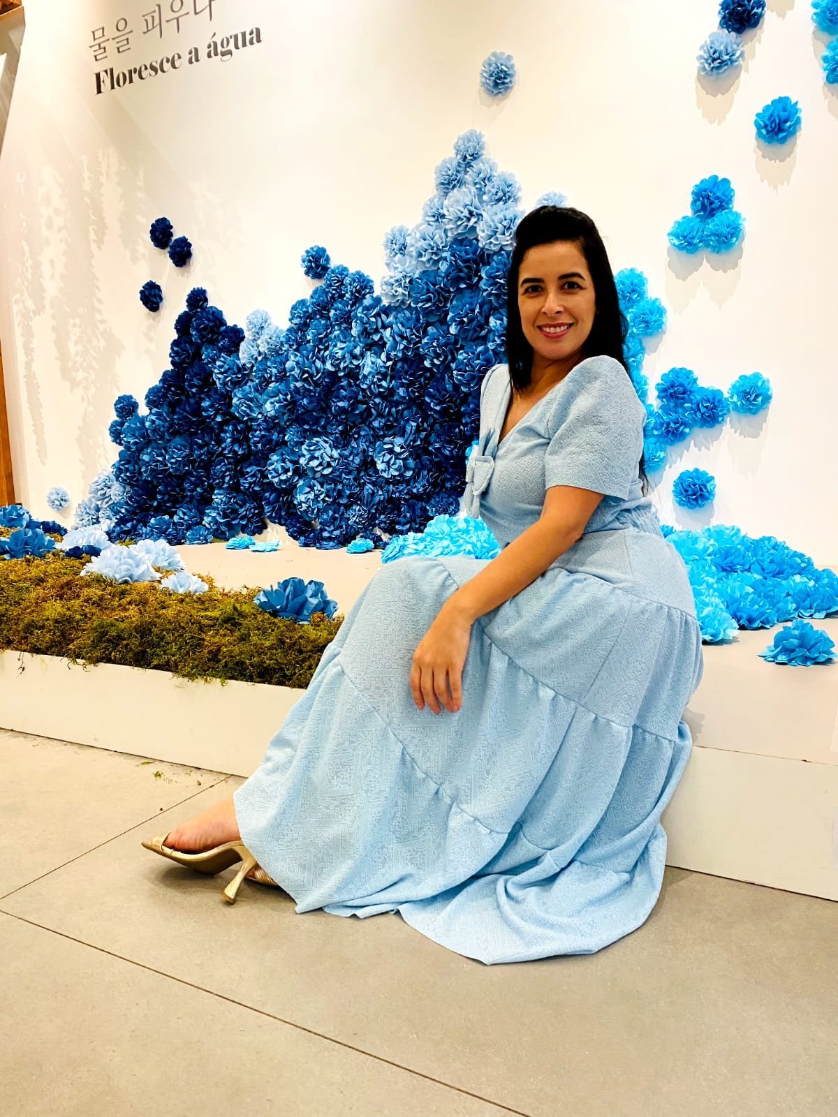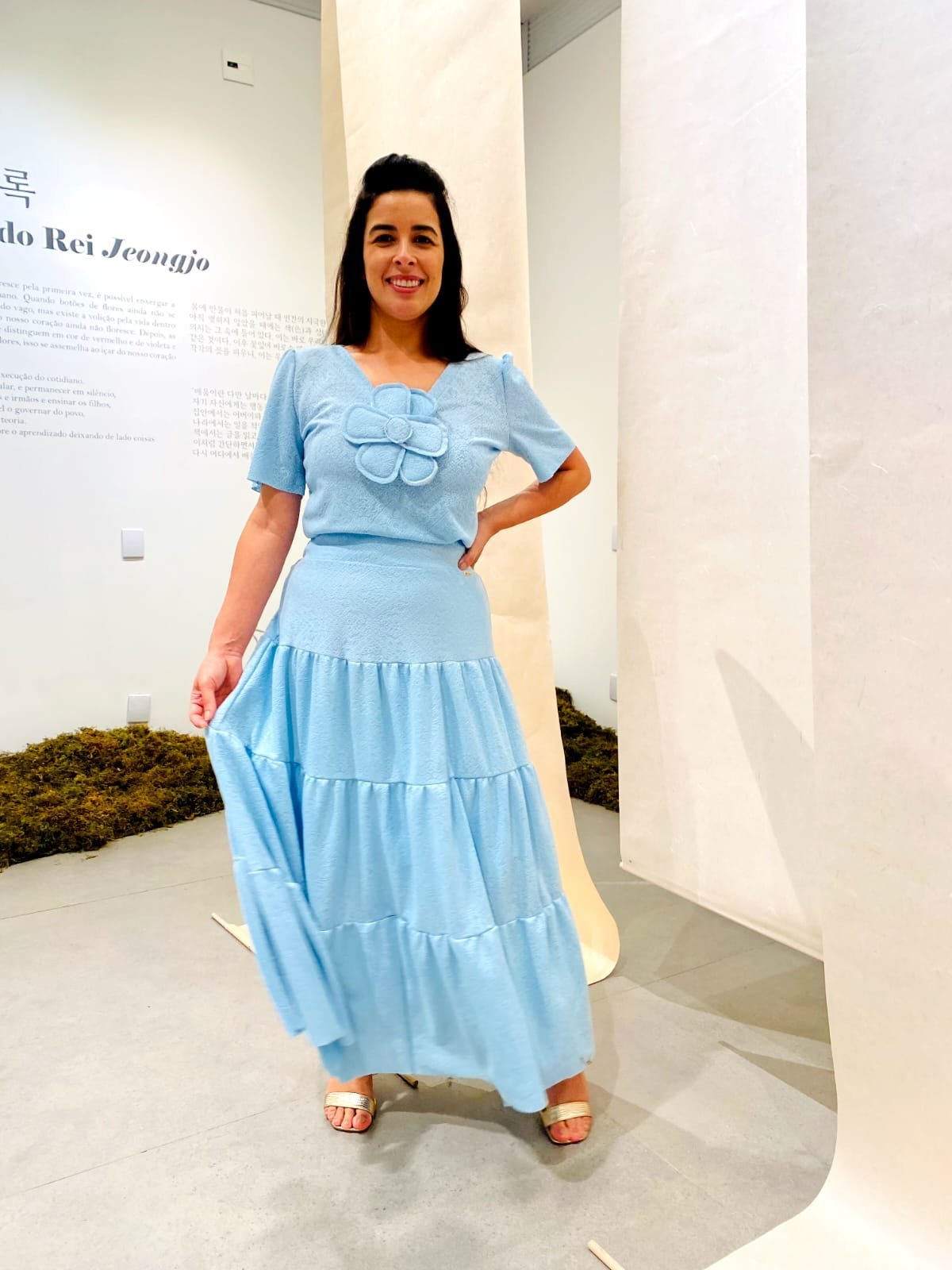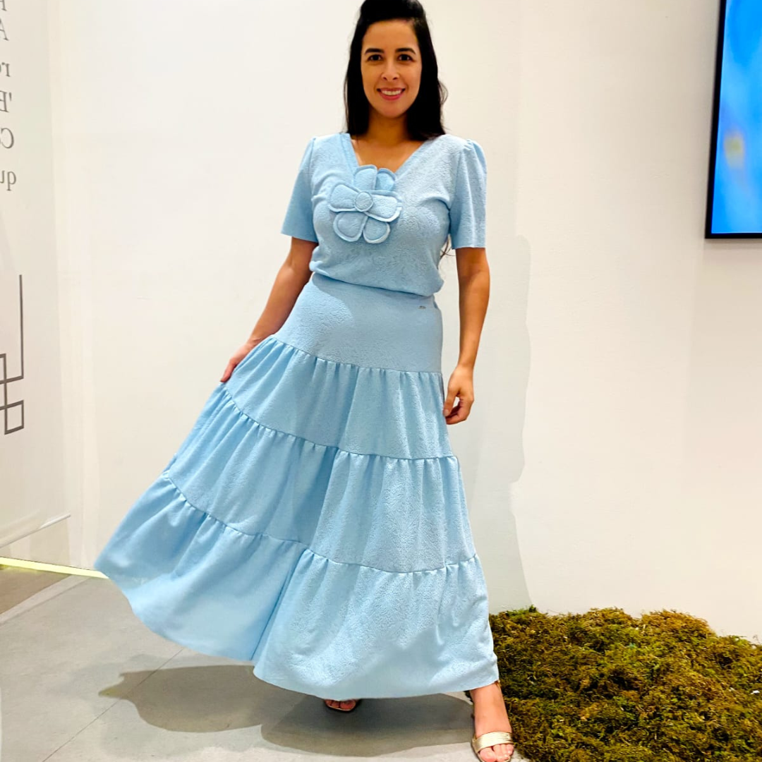 A saia e costas possui um cós de elástico, saia de 3 marias e bolsos laterais funcionais