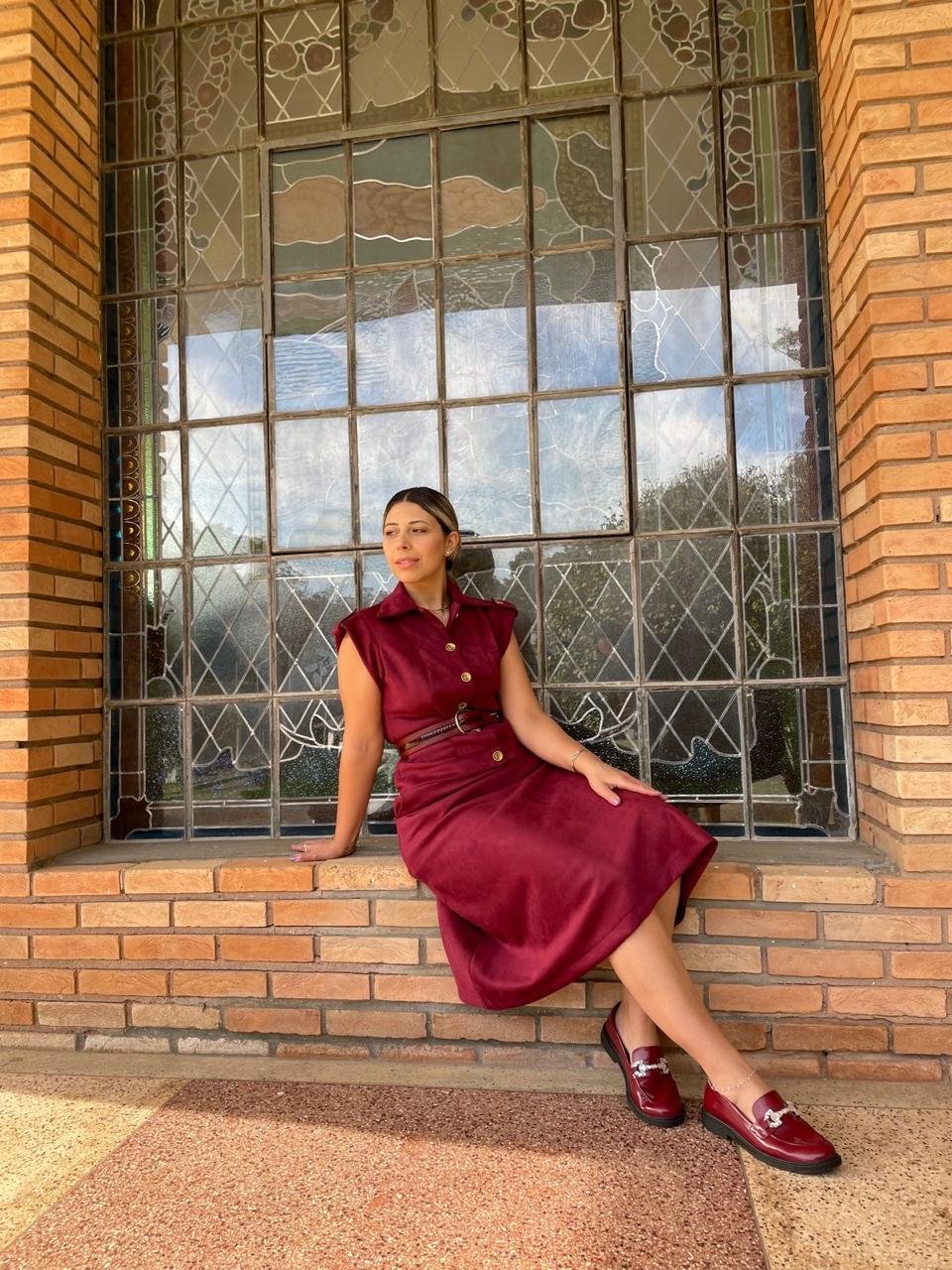 A Saia Terra, com seu godê imponente e a textura suave da camurça, traz o volume e o caimento que transformam cada passo em presença.