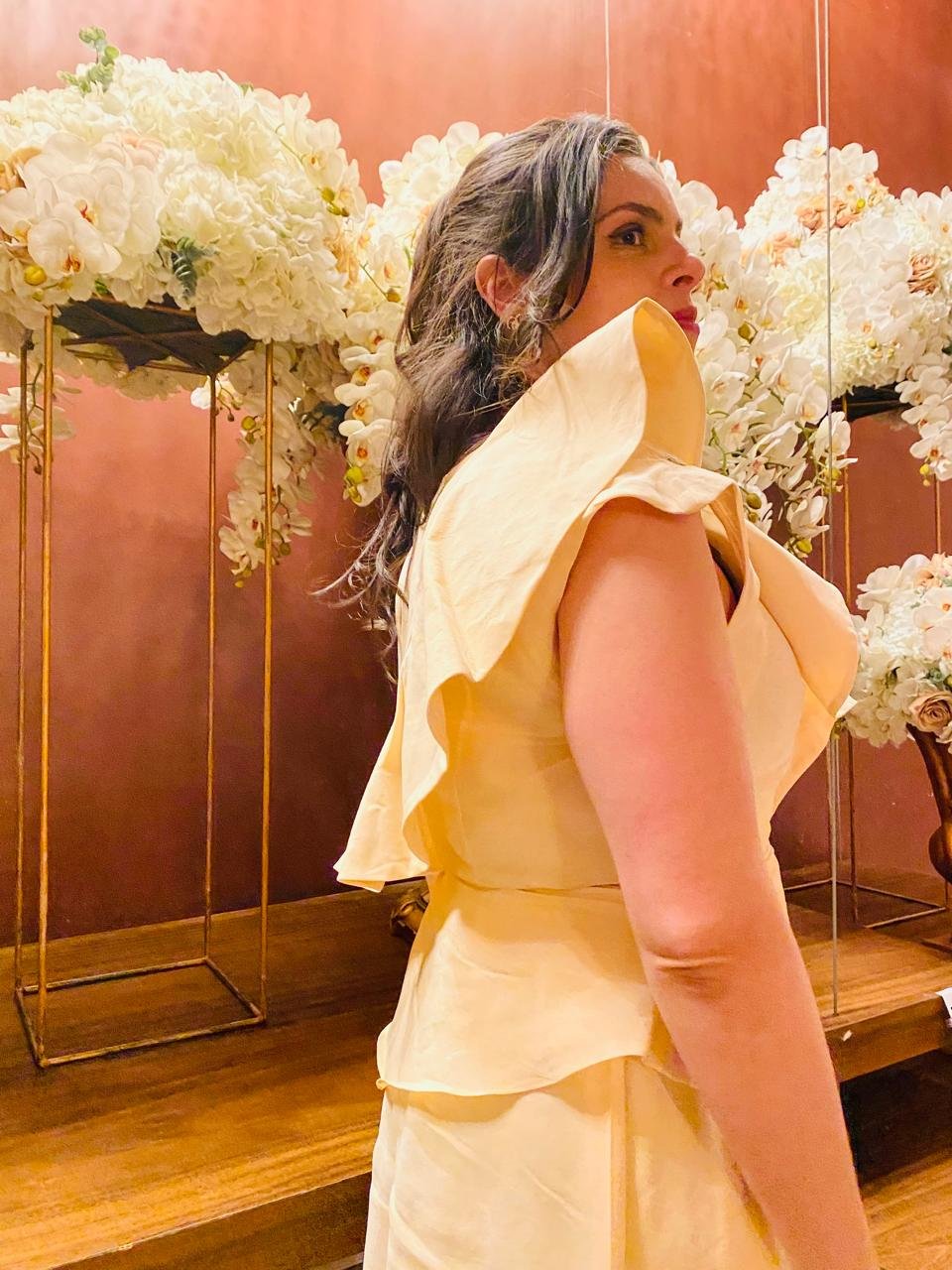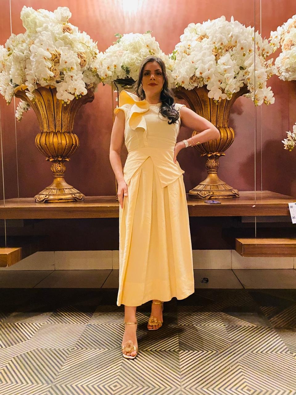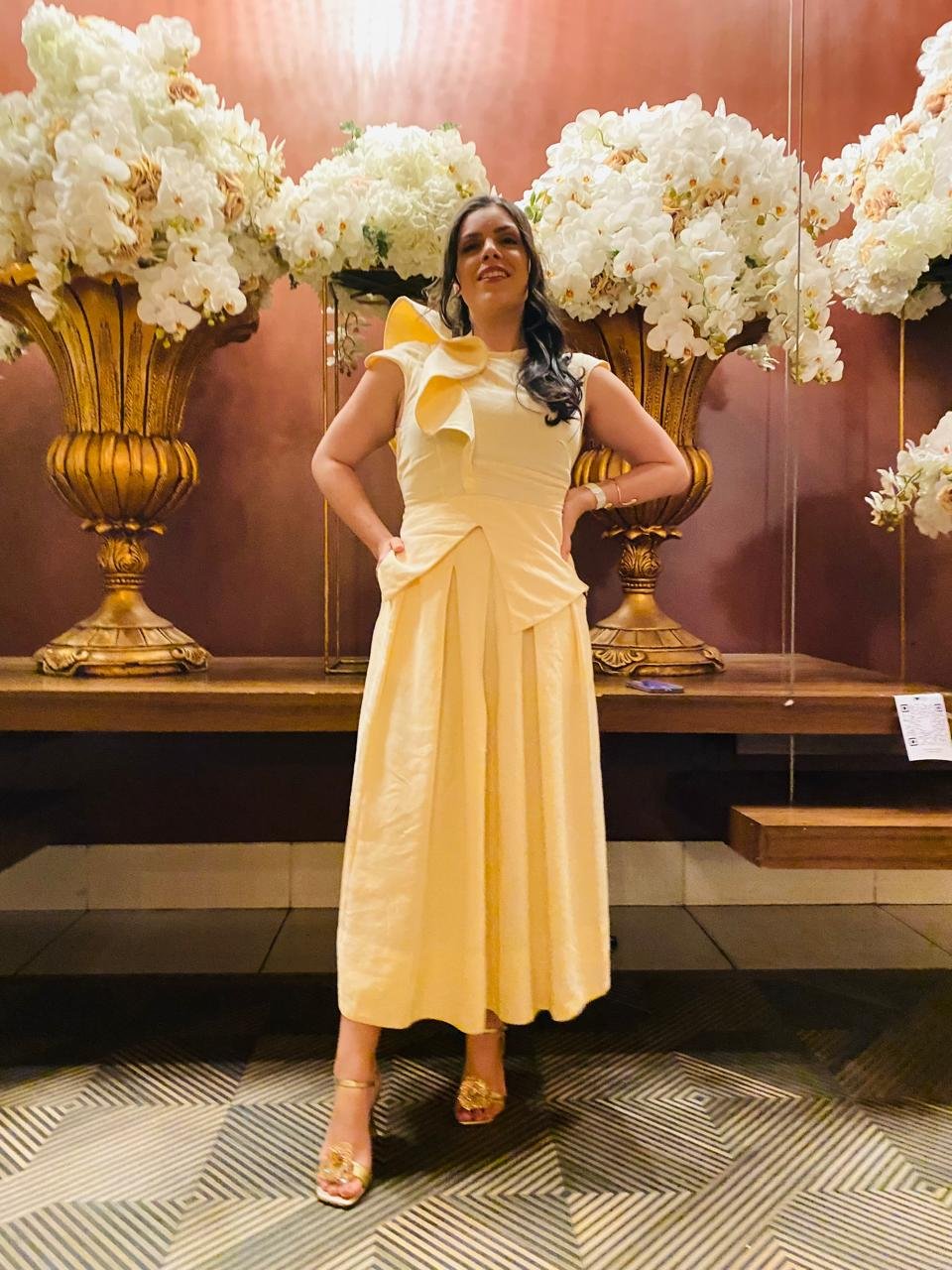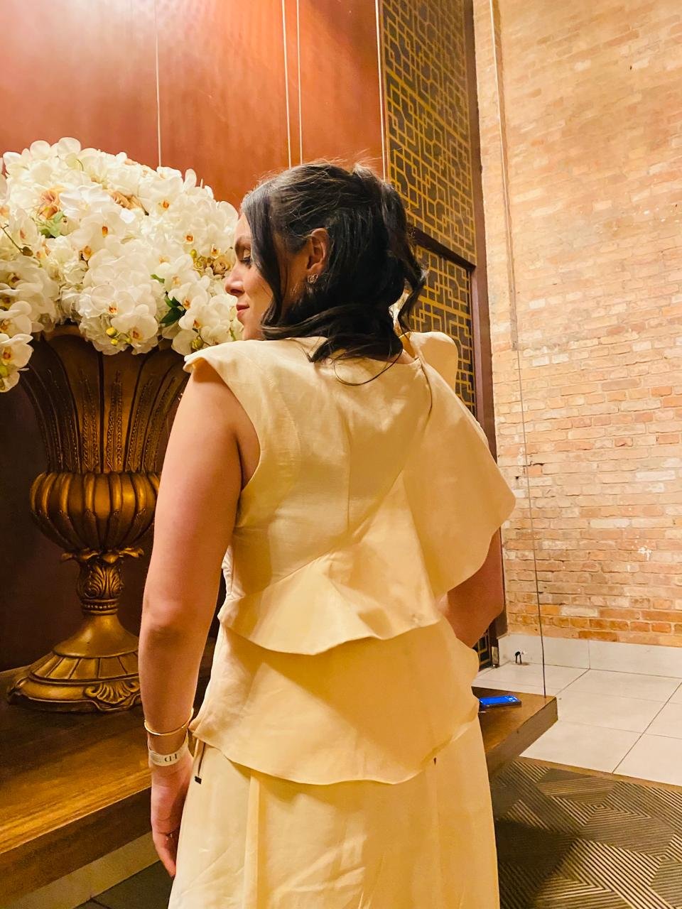 O Conjunto Sarah é a escolha perfeita para quem busca elegância, conforto e sofisticação. A blusa assimétrica possui modelagem exclusiva com babados do lado direito, que vão da frente até as costas, cintura marcada e peplum frontal com pontas irregulares. Nas costas, o peplum é simétrico, complementando a harmonia do look. O decote redondo e o zíper lateral garantem facilidade ao vestir.