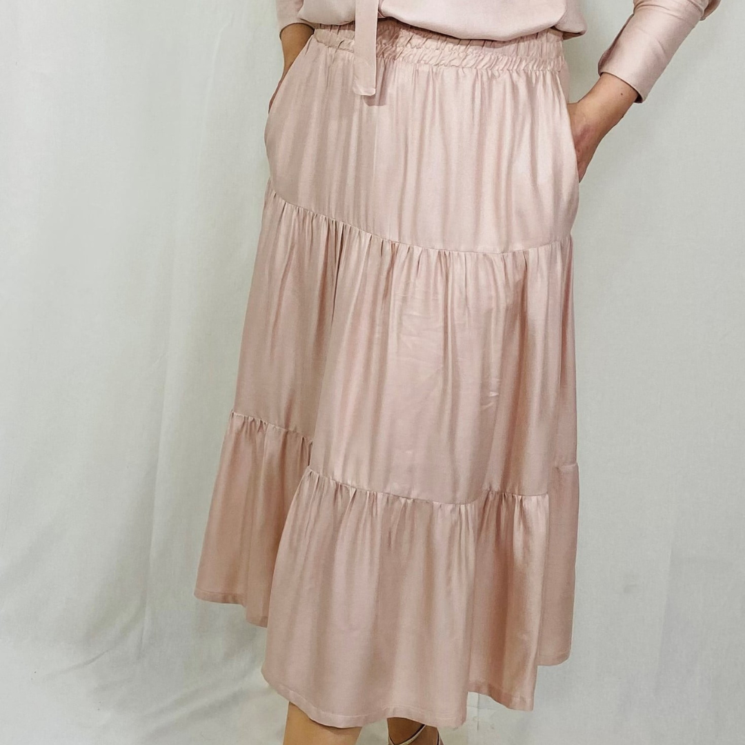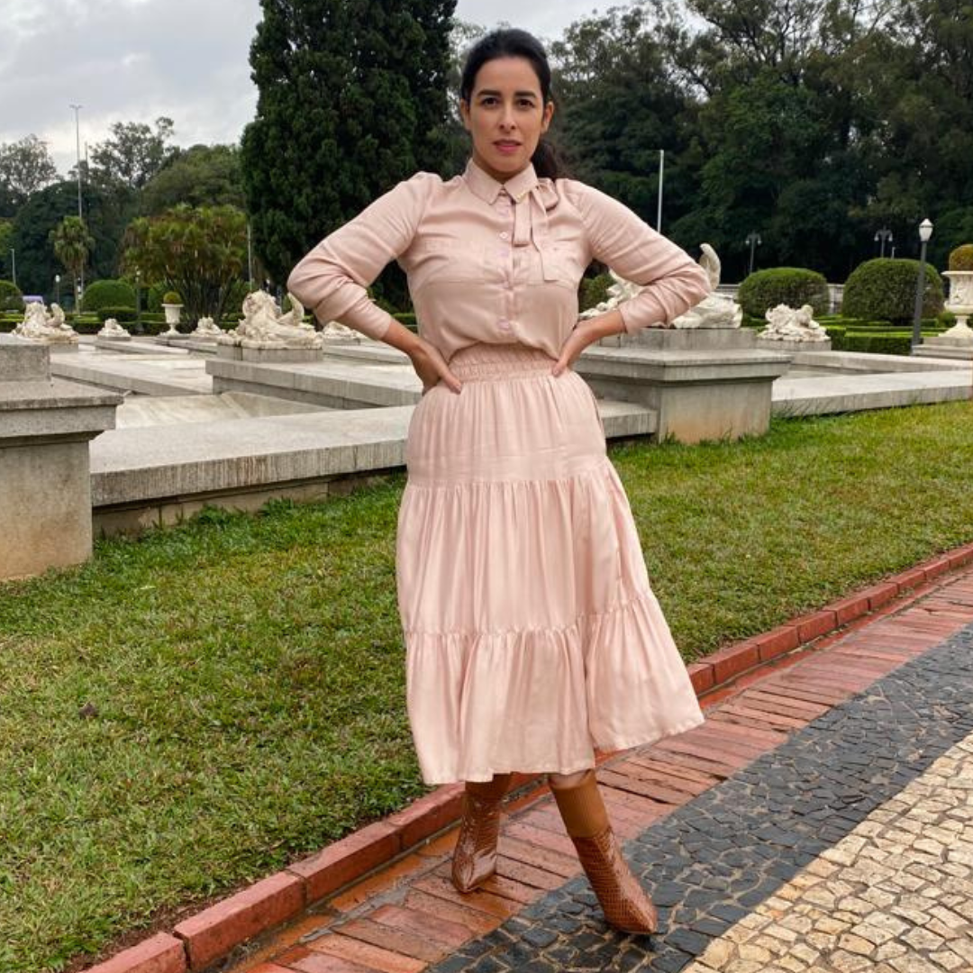 Saia com elástico na cintura, bolsos laterais que amamos, trazendo conforto e confiança deixando perfeitamente estilosa na montagem dos seus looks, comprimento midi, modelagem ampla com 3 Marias.