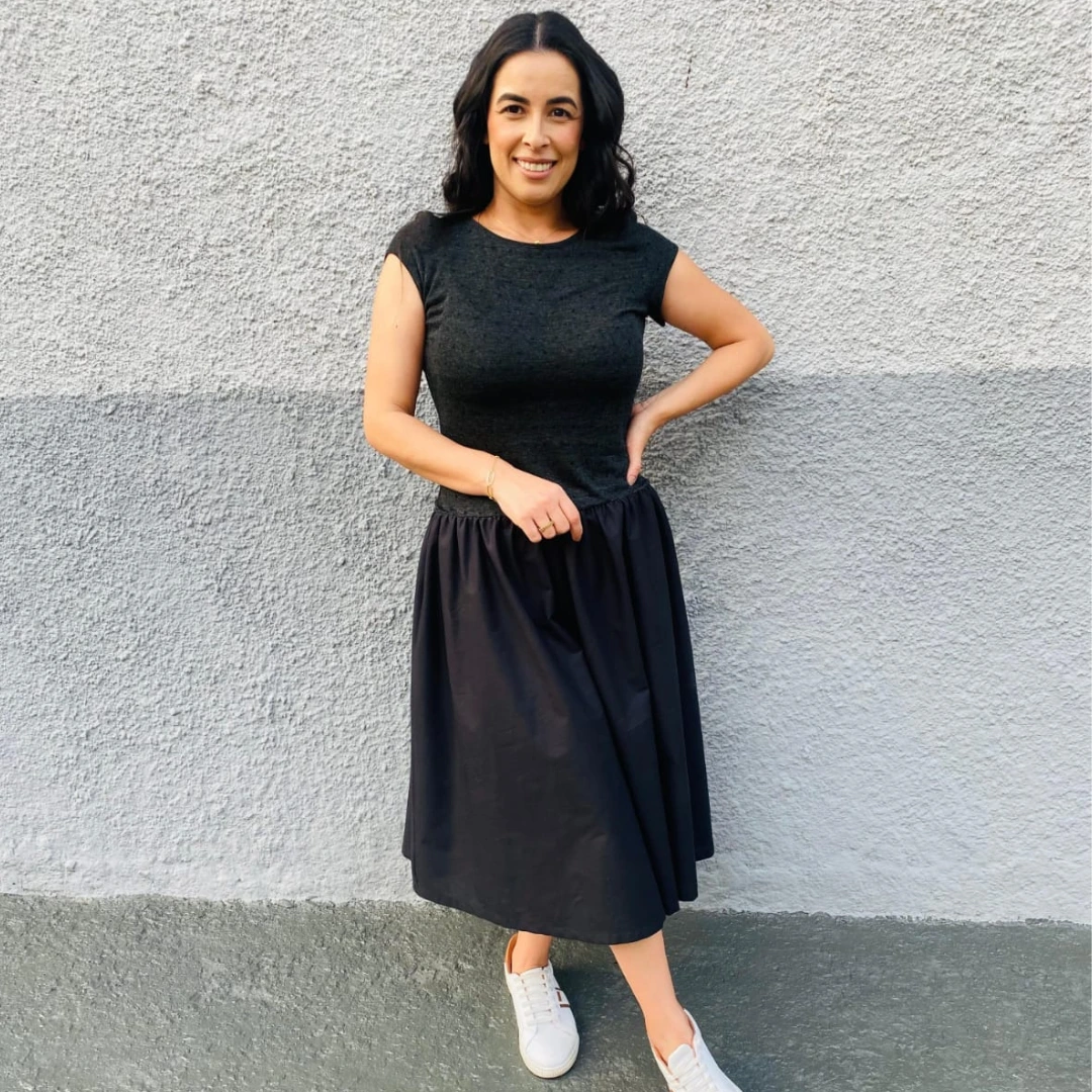 Vestido Cássia, gola redonda com punho, mini manga dupla, cintura baixa e saia franzida, essa tendência voltou com força total, deixando o look mais informal e comprimento midi.