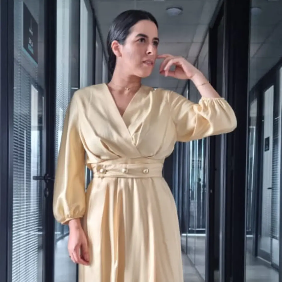 Vestido Catharina, decote em V transpassado com pregas, cintura marcada com cós duplo, saia com pregas proposital para disfarçar o abdome, com um fenda aberta discreta até o joelho, localizada dentro de uma prega.