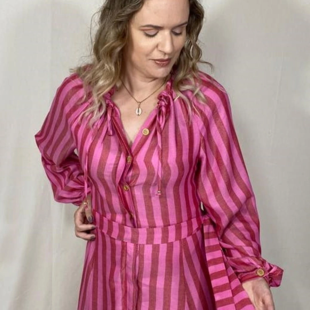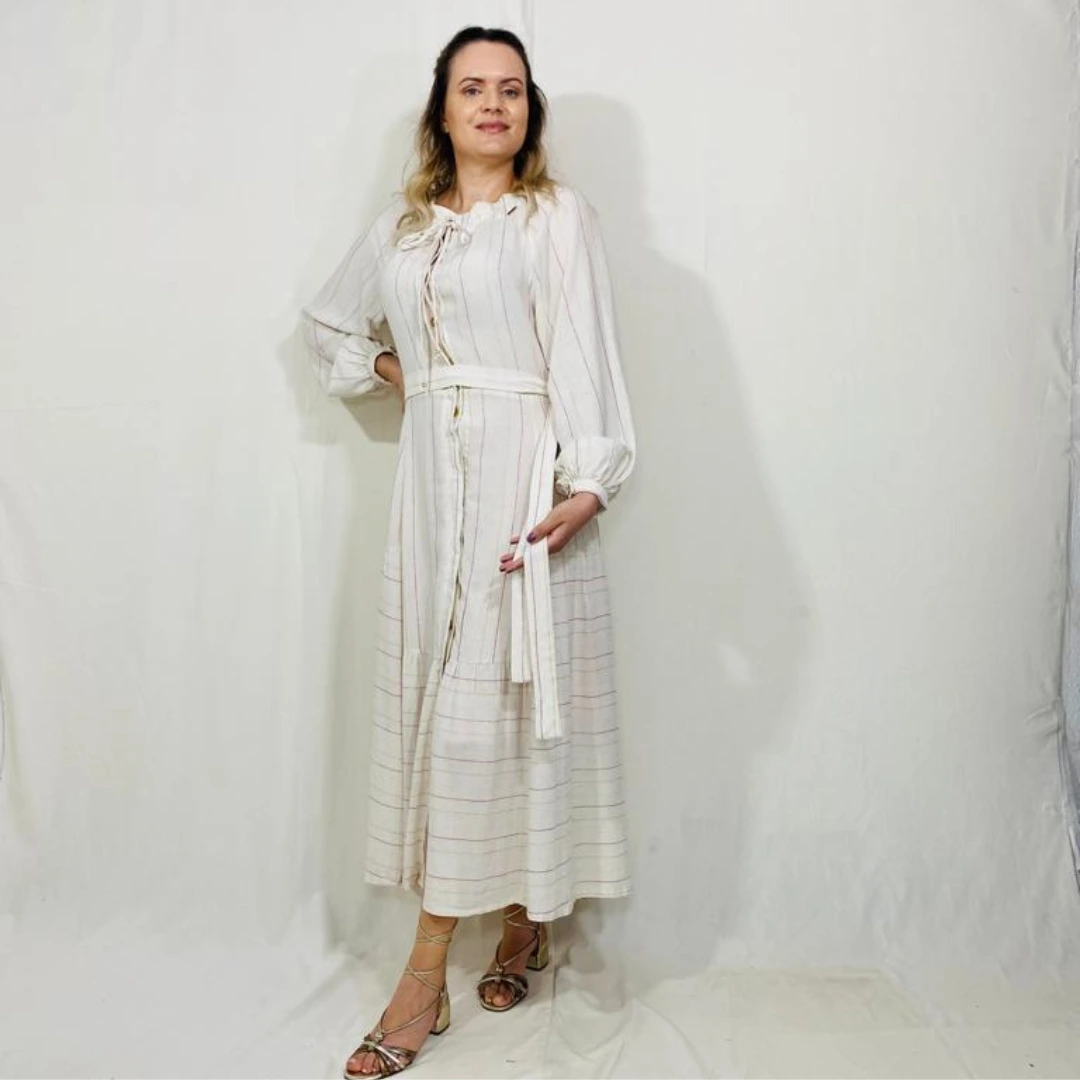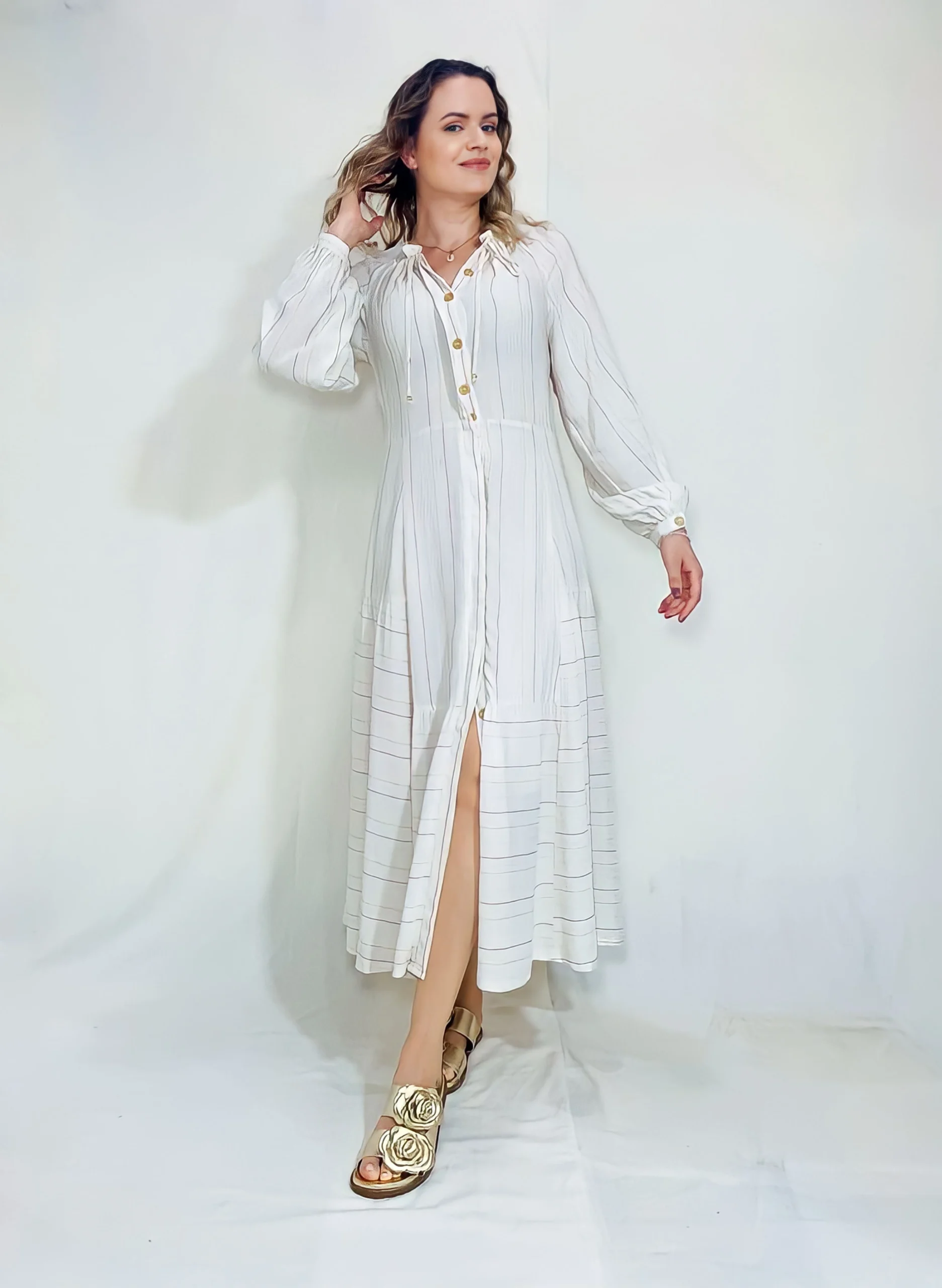 Vestido Cristal, manga longa e comprimento max midi, decote perfeito para ajuste com elástico, proporcionando versatilidade em usar aberto ou fechado, botões frontais funcionais, com caimento que modela a silhueta.