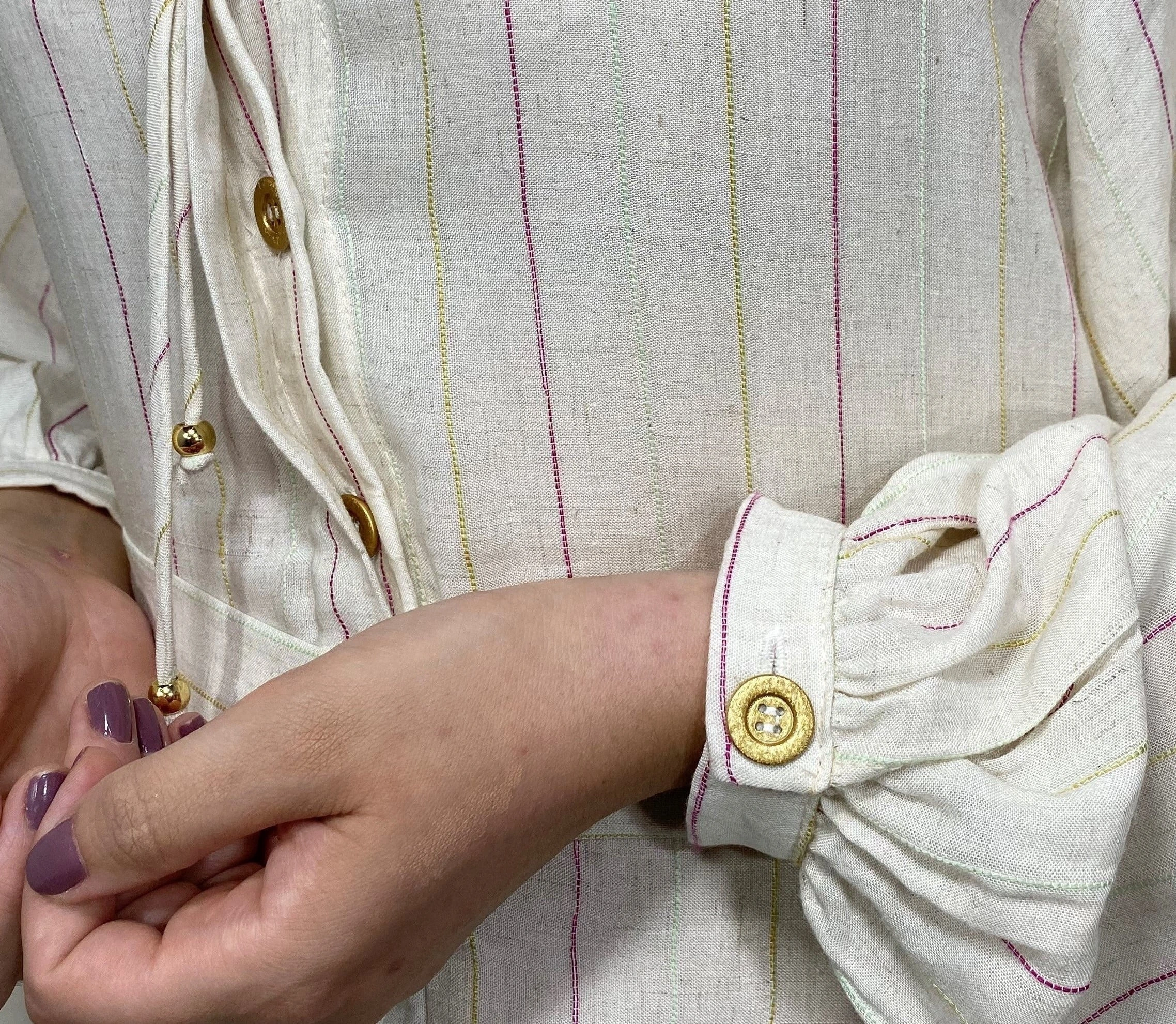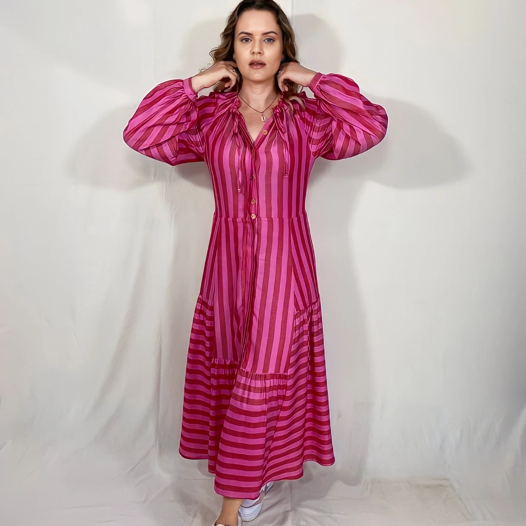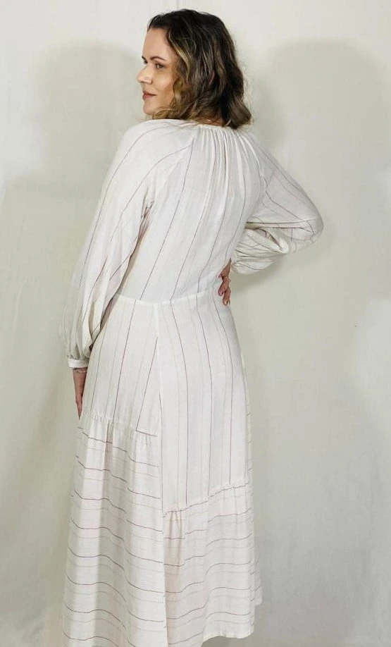Vestido Cristal, manga longa e comprimento max midi, decote perfeito para ajuste com elástico, proporcionando versatilidade em usar aberto ou fechado, botões frontais funcionais, com caimento que modela a silhueta.