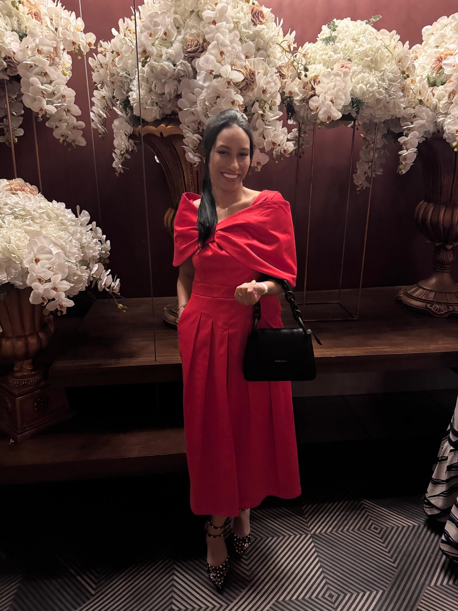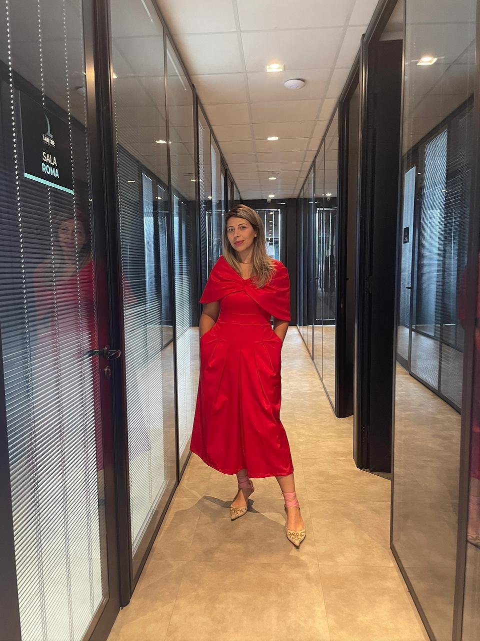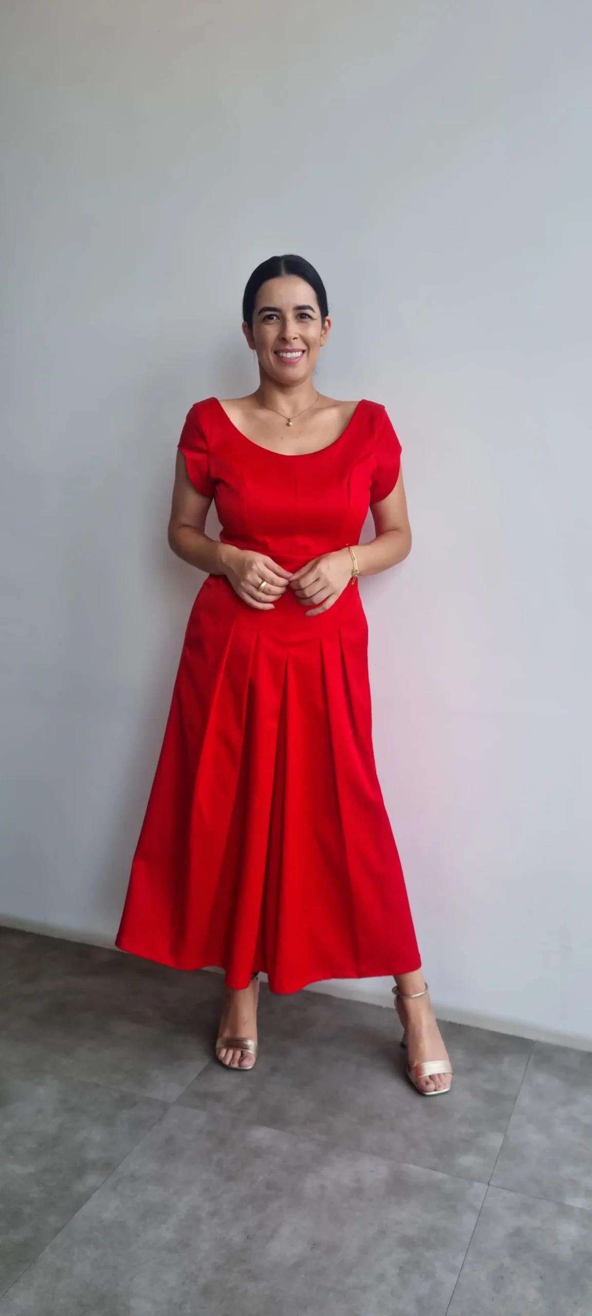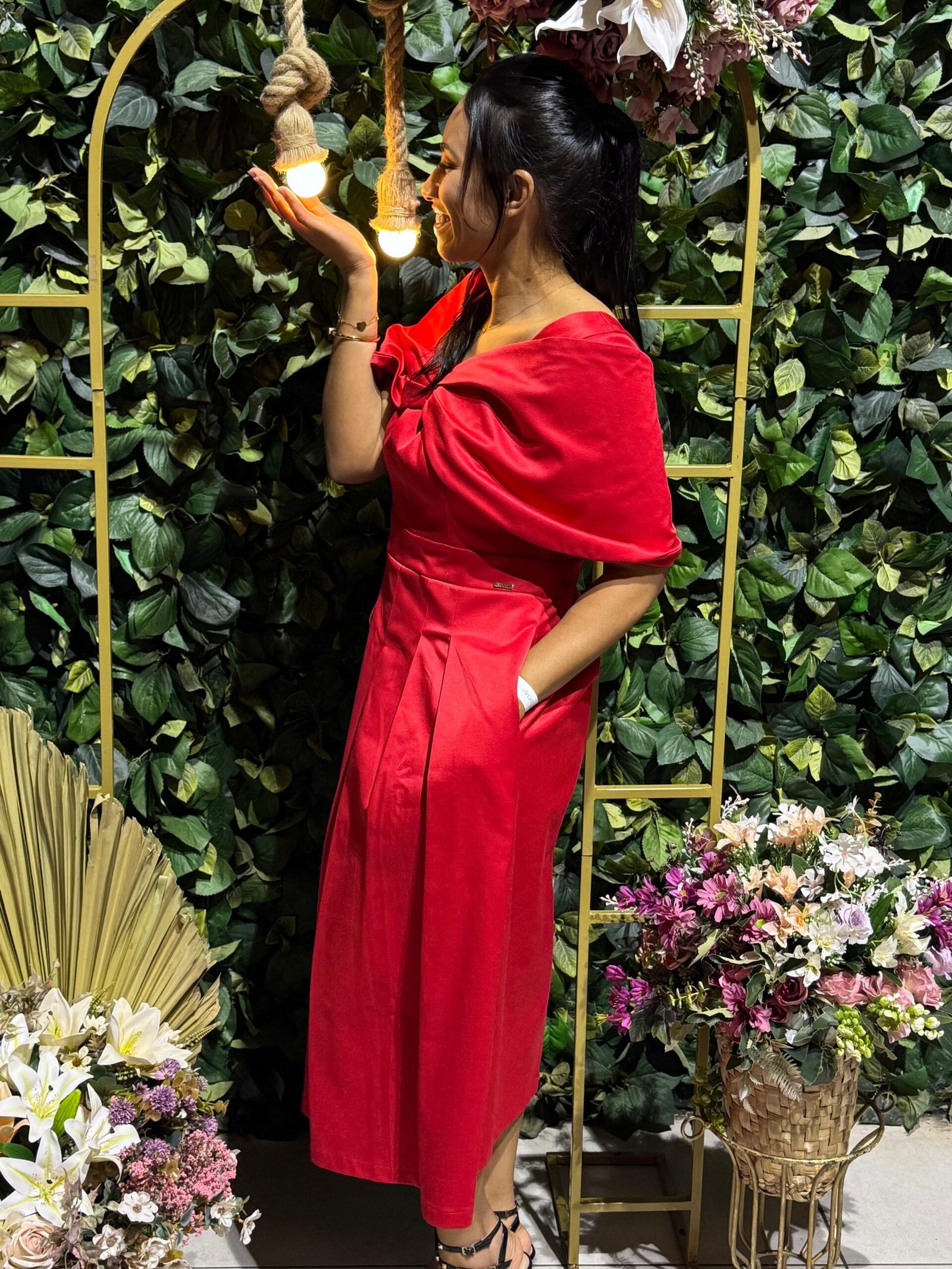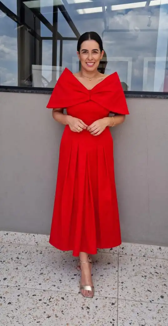 bolso lateral sem incomodar e sem aparecer para não tirar a estética do vestido sofisticado, costas com decote v e zíper invisível para visibilidade com cós na altura da cintura, comprimento midi deixando a peça ainda mais elegante.
