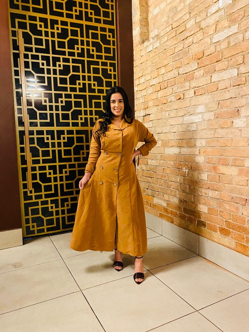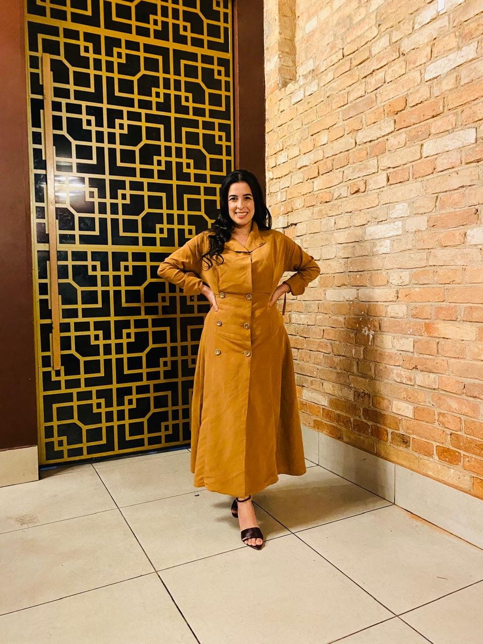 Nas costas, o vestido apresenta 4 pregas e decote alto, enquanto o ombro caído e a manga longa com punho de 12 cm e amarração trazem modernidade e delicadeza. Bolsos laterais funcionais e cinto opcional completam a peça, unindo estilo e praticidade.